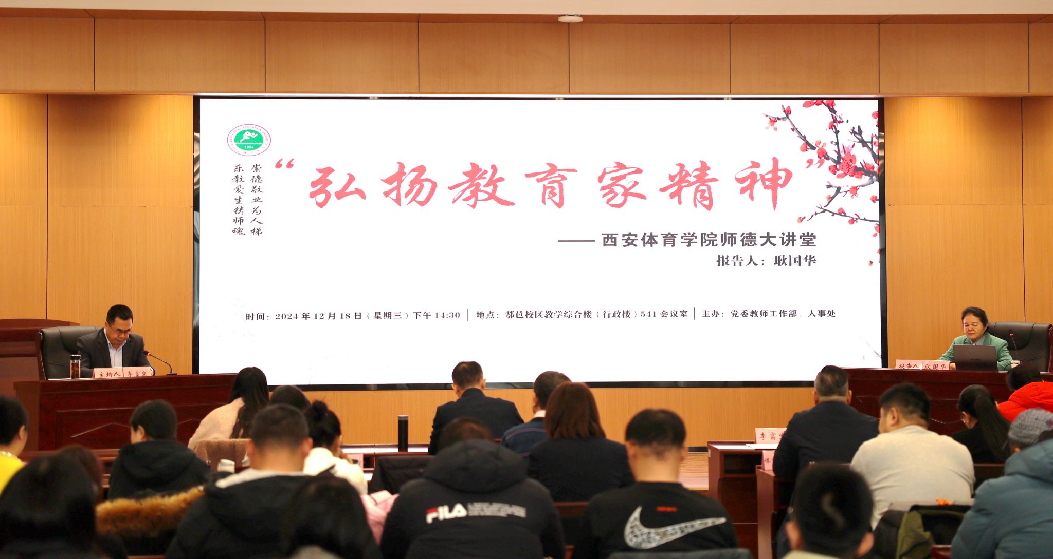 本网讯 12月18日下午,我校在鄠邑校区综合楼报告厅举行建校70周年系列活动暨“弘扬教育家精神”师德大讲堂第六场报告会。邀请西北大学二级教授、全国教学名师耿国华作《关于高校教师使命担当的体会实践》专题报告,报告会由李富生校长主持,相关部门负责人及教师代表百余人到场聆听报告。